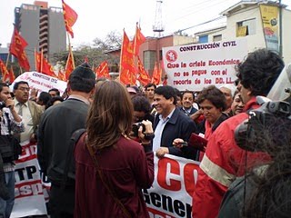 Nota. La foto muestra un aspecto de la manifestación en Lima organizada por la CGTP. Podemos ver al compañero Mario Huamán, secretario general, declarando a los periodistas la solidaridad de los peruanos con la huelga general española. La foto la hizo nuestro amigo Carlos Mejía. A continuación le damos la palabra a don Lluís Casas.